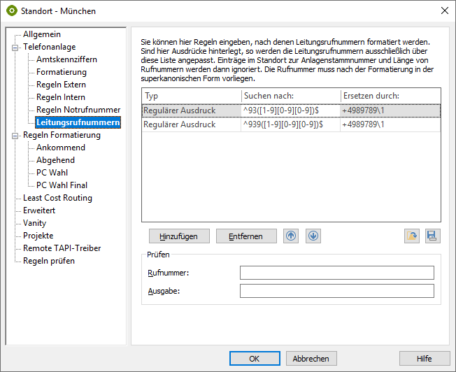 The appropriate rules for formatting must be entered for each location in the UCServer administration under Telephone system → Line numbers using regular expressions.