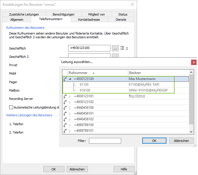 Example screenshot: Settings for users – Phone numbers – Select line – Phone number