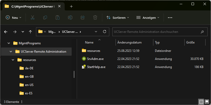 Example screenshot: UCServer Remote Administration – Folder structure for resource, SrvAdm and StartHelp.
