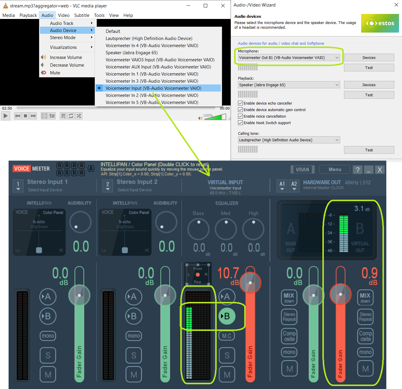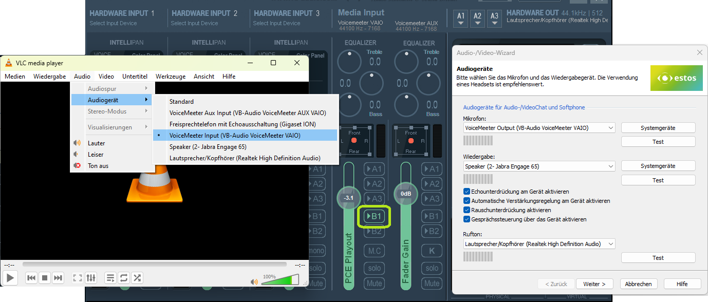 Example screenshot: ProCall Desktop for Windows with audio/video wizard and selection of audio devices – VLC media player – audio device – VoiceMeeter Input