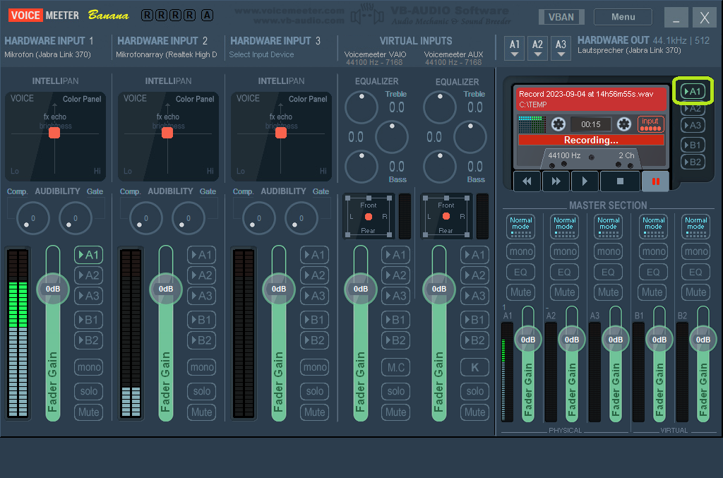 Example screenshot: VoiceMeeter Banana Recorder Options - PostFader Outputs - Fader Gain