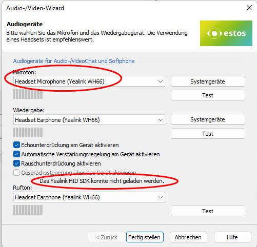 Example screenshot: Error message in ProCall Audio/Video Wizard – Yealink HID SDK could not be loaded...