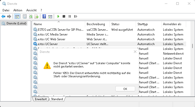 The UCServer service cannot be started manually. When trying to start the estos UCServer service, an error message appears.