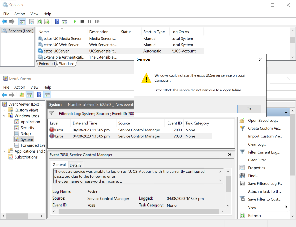 Usually, the estos UCServer service is configured with Logon as Local System. However, if this is not the case and a special service account is stored under Logon, this error occurs if the password for the service account stored in the service configuration has been changed in the meantime. In the Microsoft event viewer (eventvwr.exe) a relatively clear error message is logged.