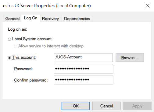 In this case, verify the password in the service configuration of the estos UCServer or change the service configuration under Log on as to Local system if possible due to technical circumstances: