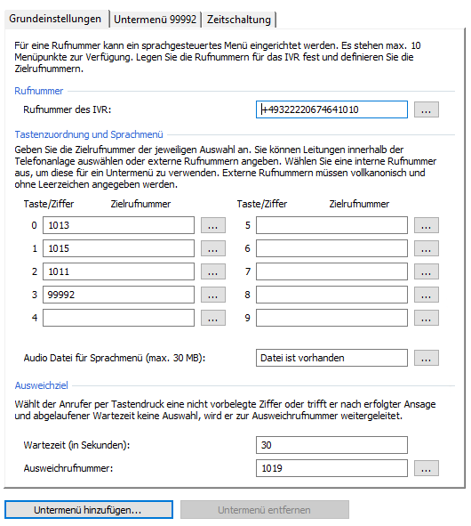 To add a submenu, select "Add submenu". Each submenu must be accessiblevia its own extension number. The internal telephone numbers 99990 - 99999 are stored in the Voice Services for this purpose.