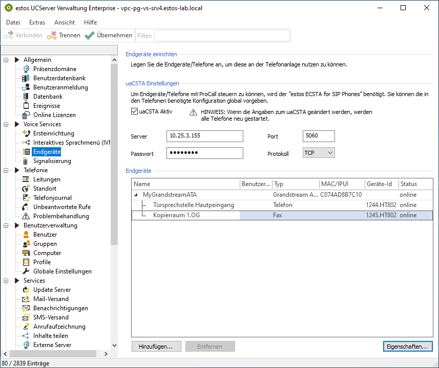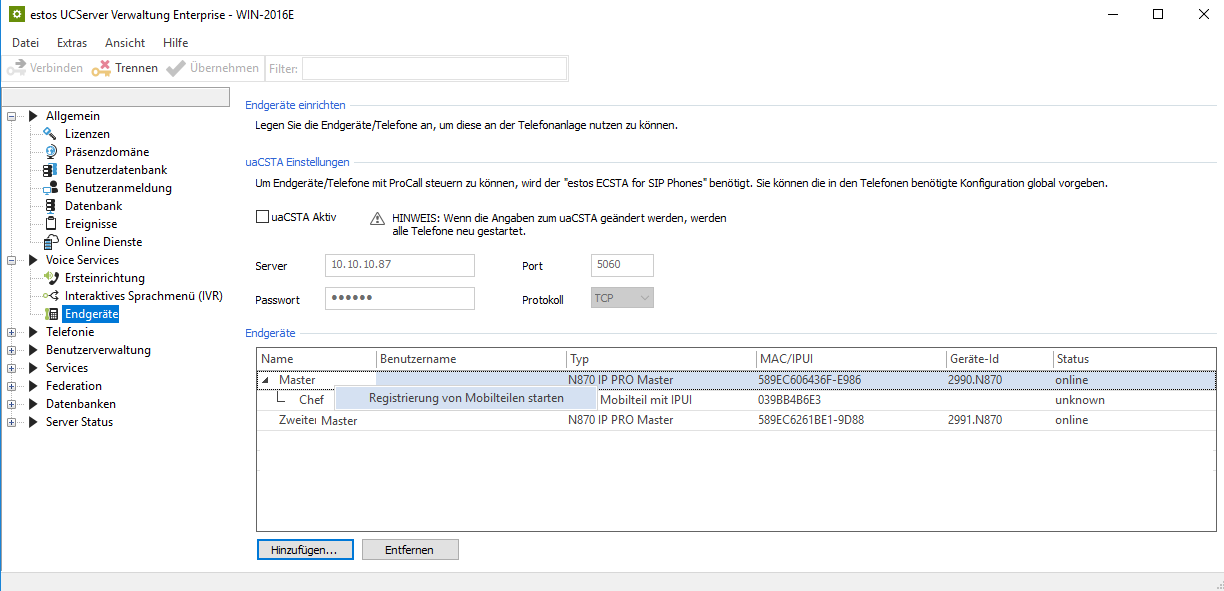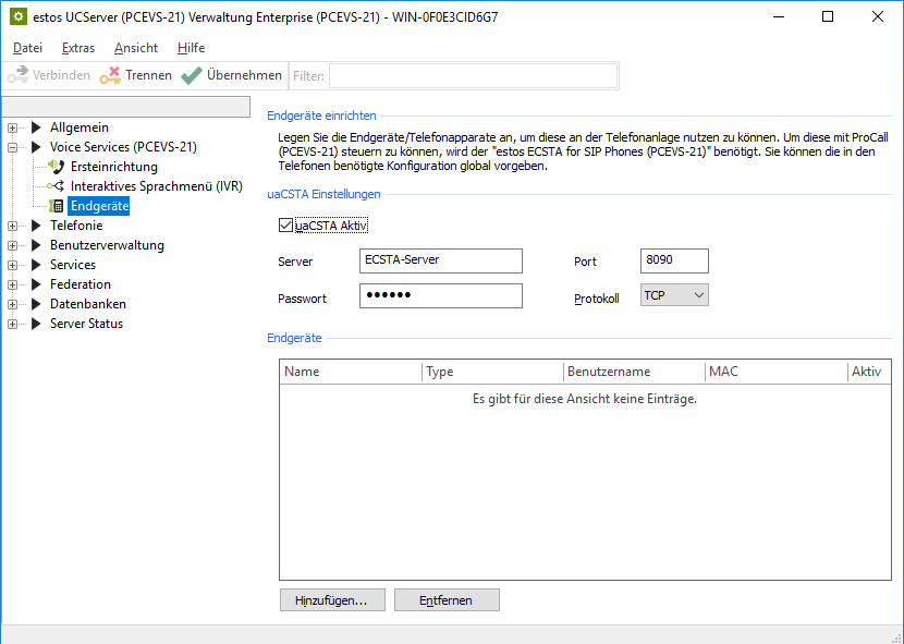Example screenshot: UCServer Administration – Voice Services – End devices – uaCSTA settings