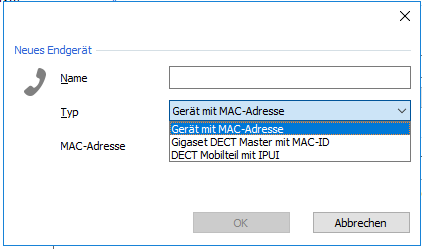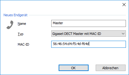 Select "Gigaset DECT Master with MAC ID" as Type, enter the MAC ID of the station and click "OK".