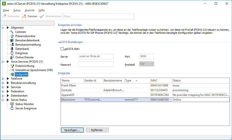 The end devices for automatic provisioning can be entered in the UCServer Administrator in the "Voice Services – End devices" menu.