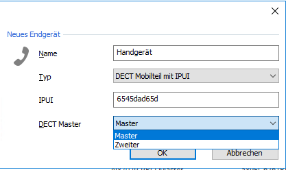 Select "DECT Handset with IPUI" as the Type and enter the IPUI of the handset. Select the desired DECT Master and click "OK".