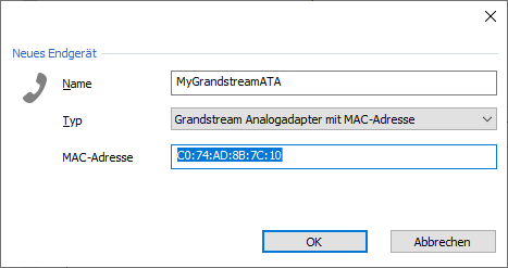Select "Grandstream analog adapter with MAC address" as type, enter the MAC address of the end device and click "OK".