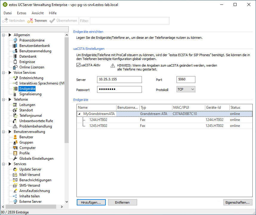 After the URL has been entered in the ATA on the web interface, the ATA has been restarted and has registered with VoiceServices, the individual analog ports are displayed in the UCServer administration under the ATA.