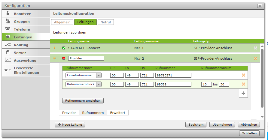 Example screenshot Configuration - Lines - Line configuration - Lines - STARFACE Connect - Name/numbers/type of line