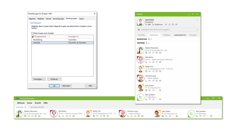 In ProCall 7 Enterprise, the existing administrative configuration options have been expanded to include favorite contacts, monitor content, speed dial buttons and user-defined actions. It is now possible to conveniently configure favorite contacts, monitor content and speed dial buttons via the UCServer Administrator and distribute the configuration to users via UCServer groups. The previously time-consuming configuration via customization and distribution of XML files is no longer necessary.