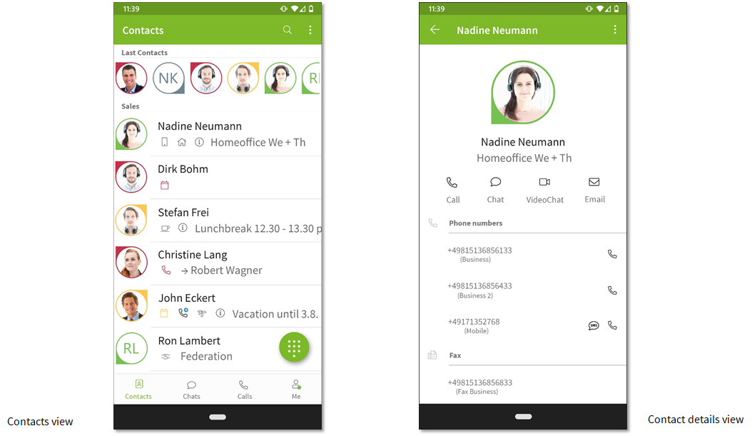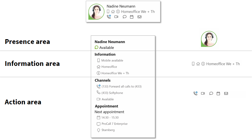 In order to improve the visual differentiation of information and actions, the contact cards were divided into clearly defined areas for presence, information and action. Care was taken to achieve the hierarchy of the information through font size, capital letters and grey tones rather than through color.
