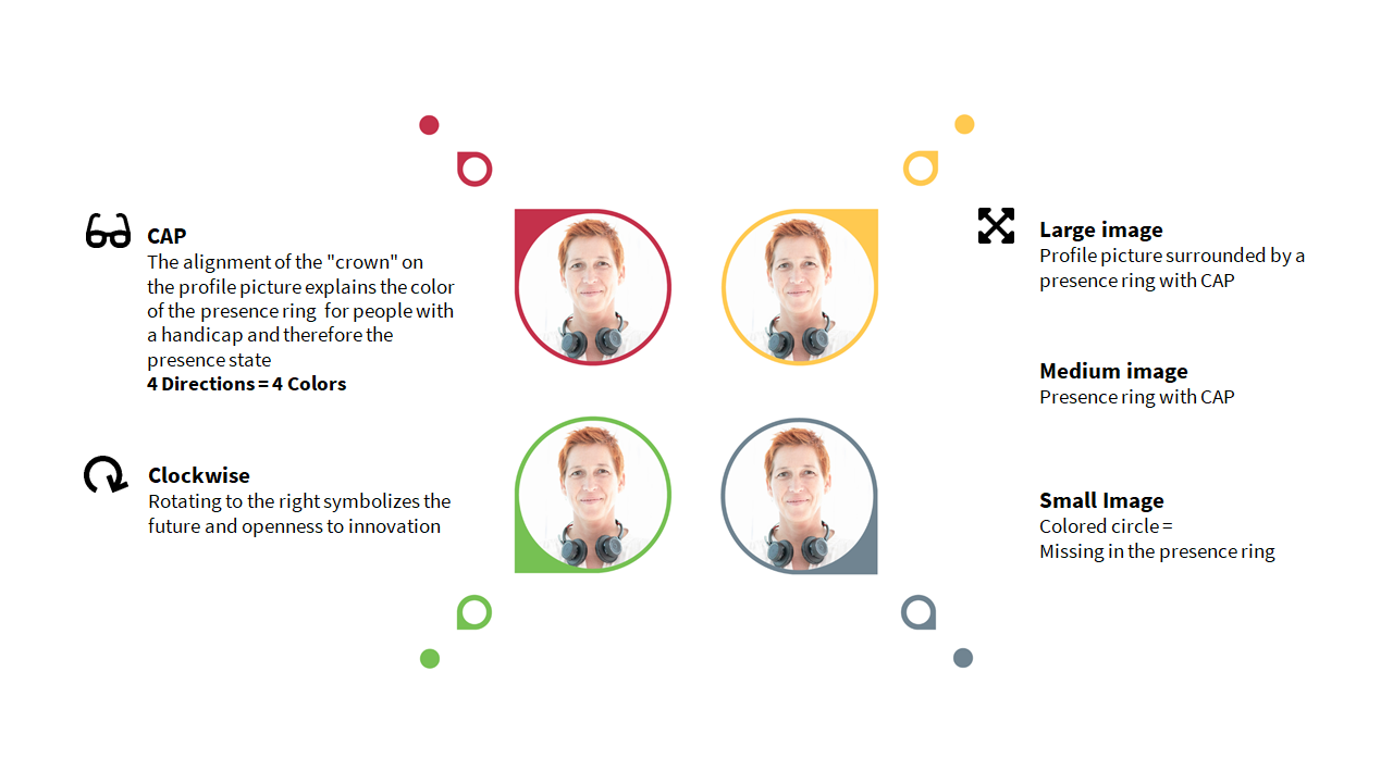 When modernizing the presence area of ProCall Enterprise, the focus is on the round display of the profile pictures, which has also led to a change in the way the presence is displayed. The new round estos presence rotates clockwise from "Available" to "Not logged in". To differentiate between the presence states, especially for people with disabilities, the alignment of the "crown" on the profile picture explains the color of the presence ring and therefore the presence state.