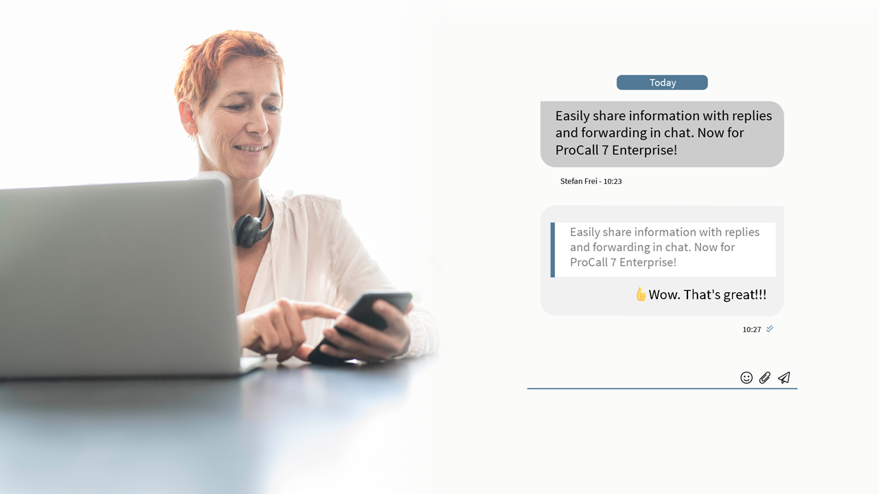 In many areas of day-to-day collaboration, it is necessary to share content with colleagues, to pass on information and work together on it. With ProCall 7 Enterprise's content sharing feature, this is now easier. Using chat in the client for Windows, iOS and Android, files, photos and videos can be quickly shared with other ProCall users.