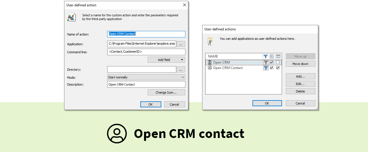 Business process integration can now be achieved with a simple configuration of the ProCall client, i.e. in many cases, the previously necessary development work is no longer required. The main menu, the context menu and the communication windows in the ProCall client can be extended by actions that start external applications via parameterizable calls. Dynamic (e.g. current call) and static (e.g. contact data from MetaDirectory) data can be accessed. The configuration can be carried out individually at each workstation or administratively on the UCServer.