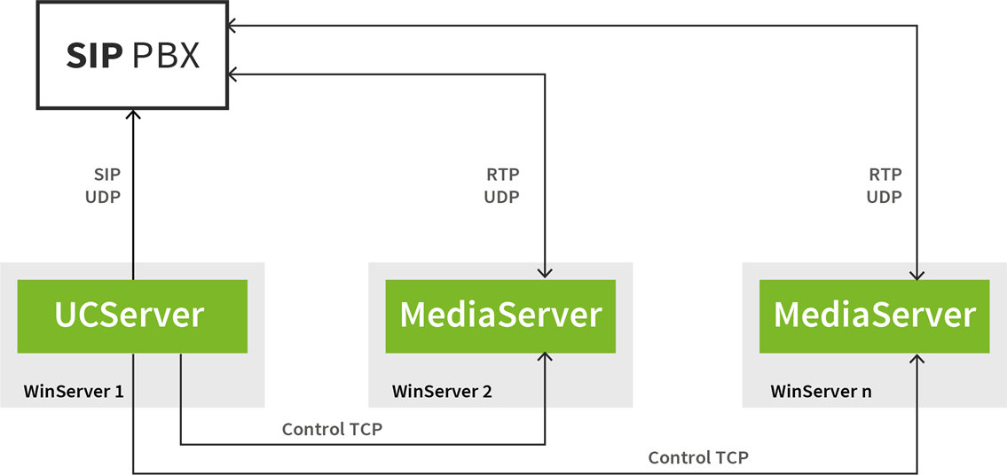 With ProCall 7 Enterprise, the media server can optionally be outsourced to a separate runtime environment to enable scaling of the UCServer. In addition, it is now possible to operate the UCServer with several media servers and thus achieve automatic load distribution of incoming and outgoing softphone calls using the round-robin method. Should one of the connected media servers fail, this is automatically detected and a failover to the remaining media servers is performed for new calls.