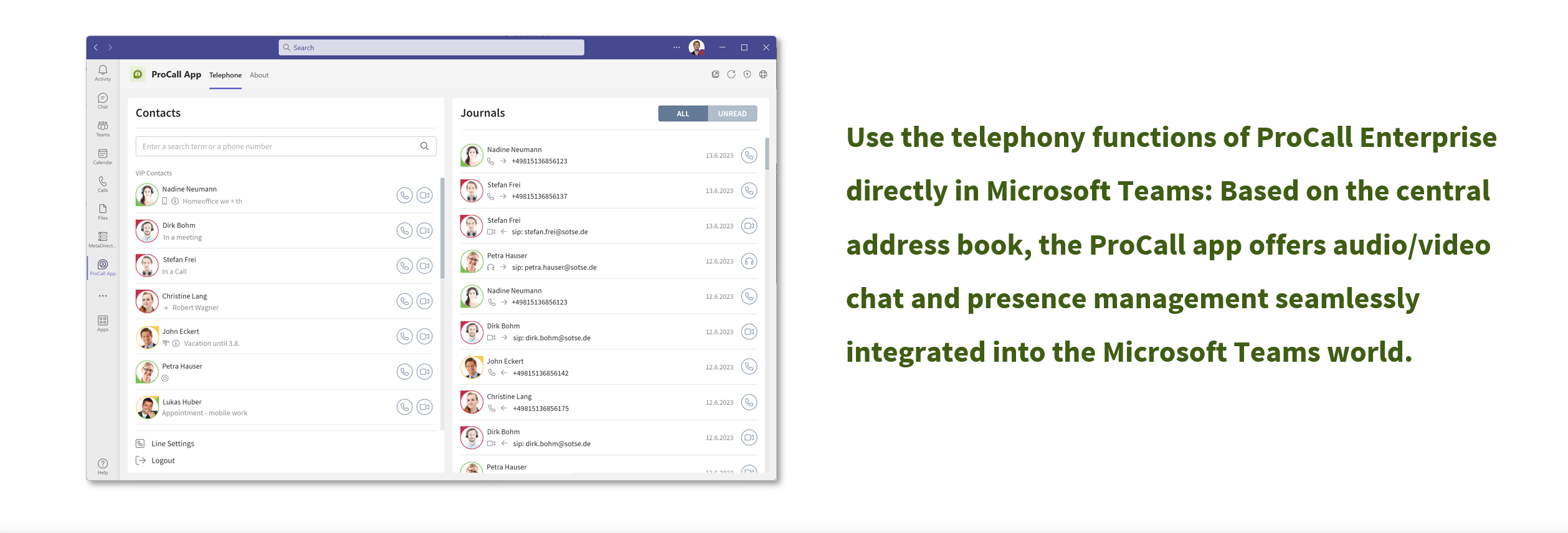 - Clear call history: Keep track of all incoming ProCall calls, audio and video chats directly in Microsoft Teams.