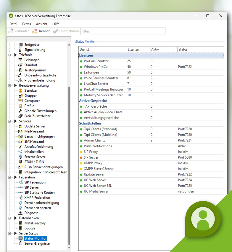 The UCServer status monitor is available for an overview of the administration of your ProCall Enterprise system. You can find it in the UCServer Administration under the Server Status  menu item.