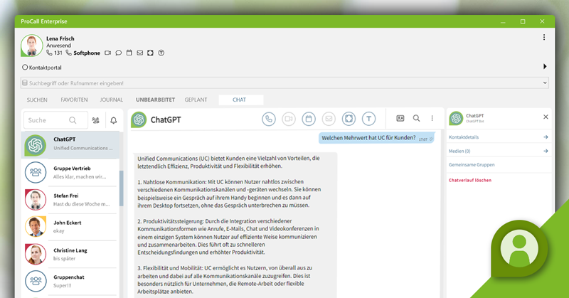 With the new extension of ProCall Enterprise by supporting the interface to ChatGPT, you can now make requests to ChatGPT directly in your ProCall Enterprise client in the chat window and quickly obtain information such as text formulations or translations. If needed, you can refine the output results by making more specific queries.