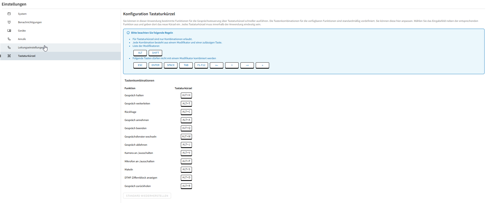 Example screenshot for configuring the shortcuts: ProCall App for Web - Settings - Keyboard shortcuts - Keyboard shortcut configuration