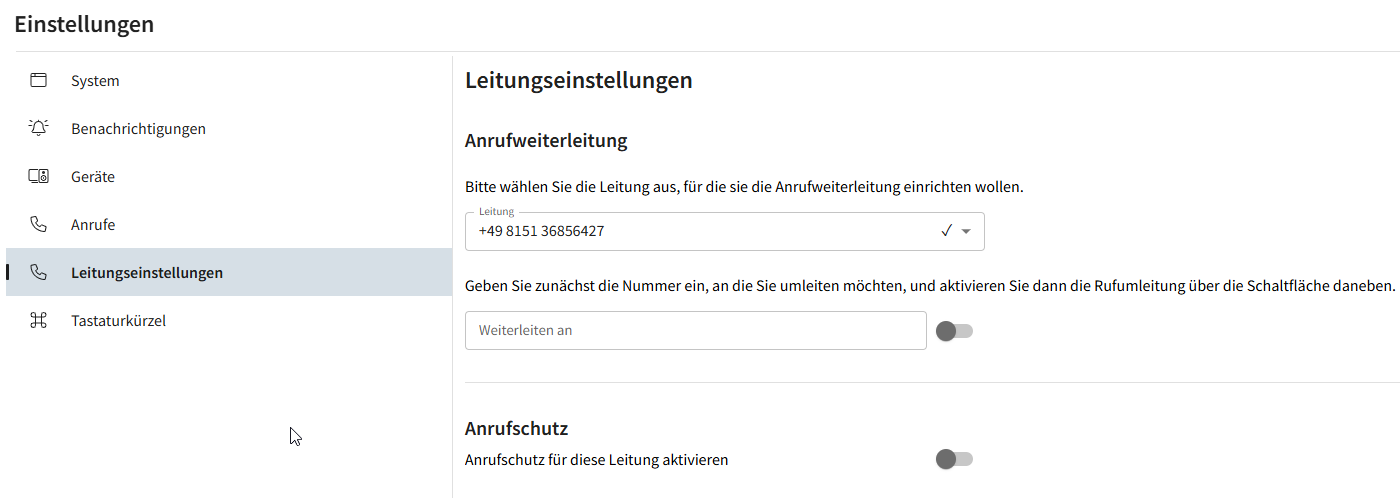 Example screenshot for configuring call forwarding and call protection/do not disturb: ProCall app for web settings - Line settings