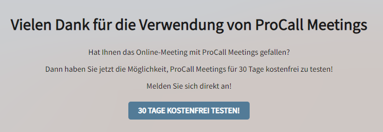 • People who attended a meeting as guests are given the option for a 30-day free demo license of ProCall Meetings after the meeting. (Offer limited in time and in German version only)