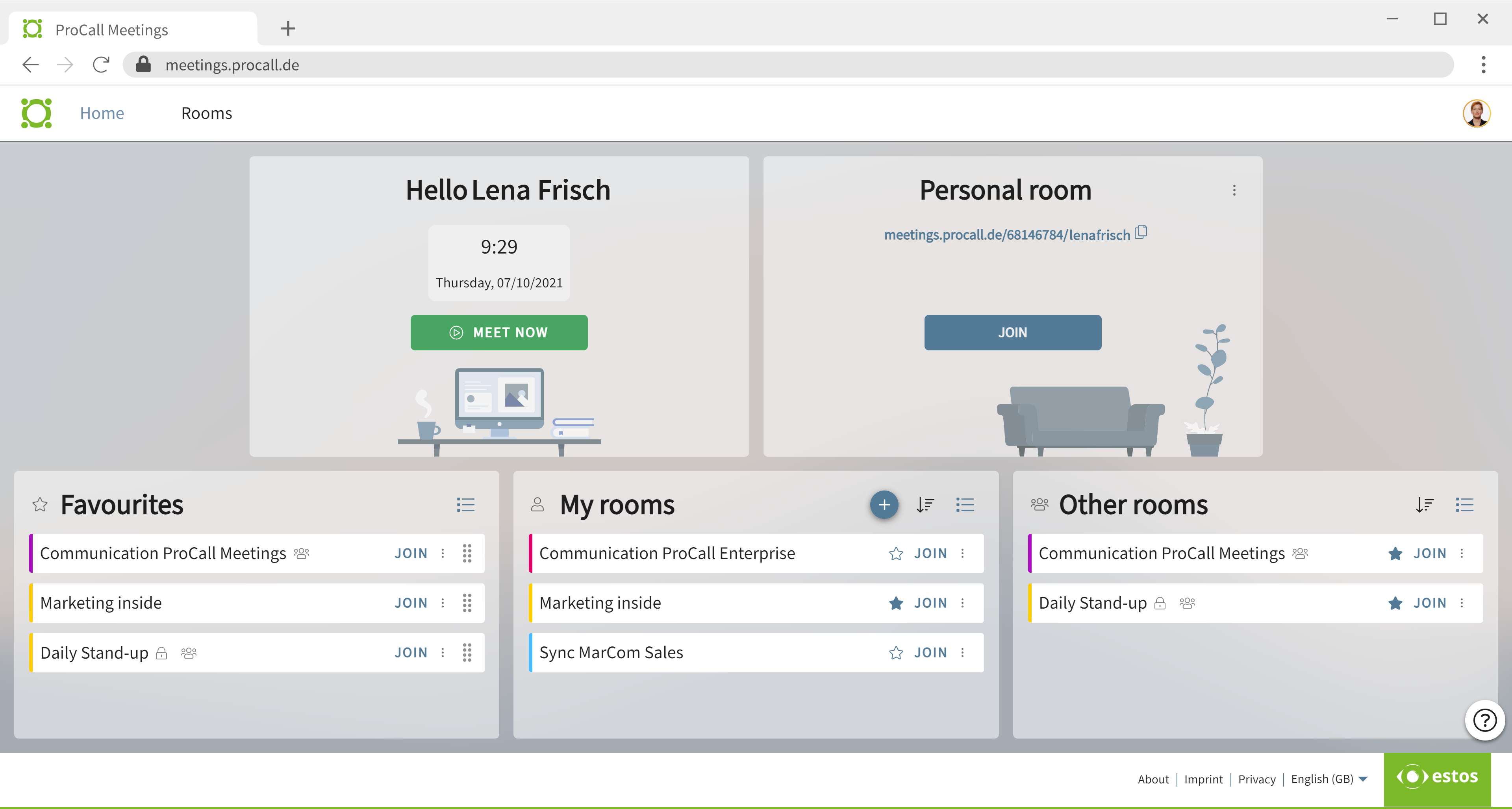 A new dashboard is available, where the general rooms and the frequently visited rooms of other users can be presented and saved as their own favorites. (Mark a room as favorites by clicking on (star).)
