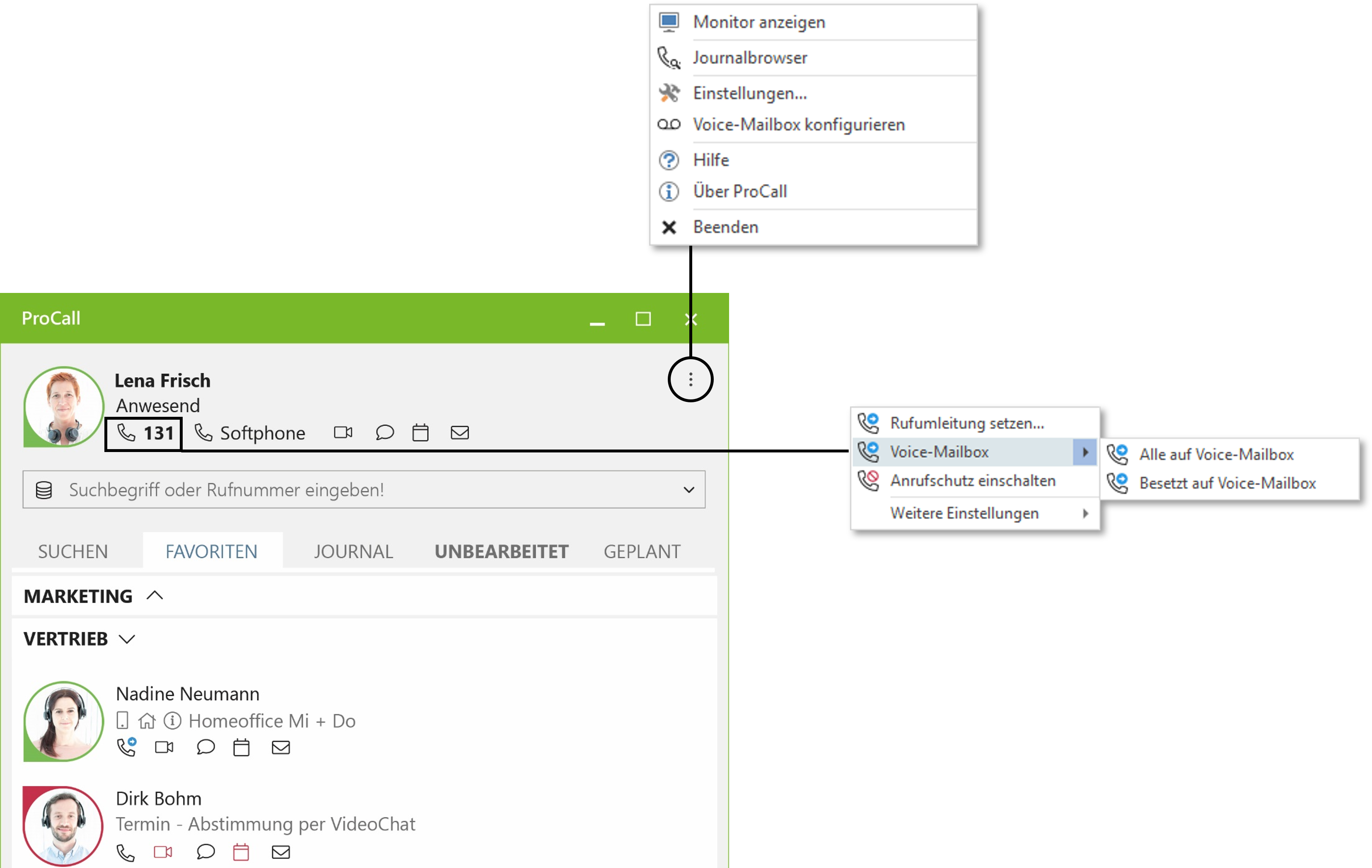 The integrated voice mail can be controlled directly via ProCall for Windows. Notifications and voice messages are delivered to the personal mailbox via e-mail.