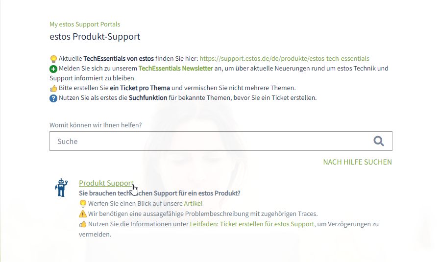 The estos ticket system is used to report malfunctions, errors, problems, observations, inquiries or other concerns where you need assistance.