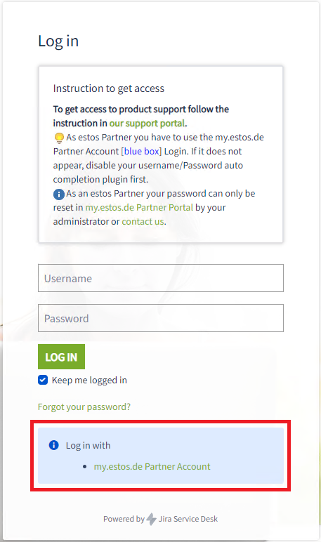 To log in, you must first register in the estos partner portal (https://my.estos.de). This will automatically activate the login for the estos ticket system. For an access to the estos partner portal you can also use the link: